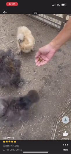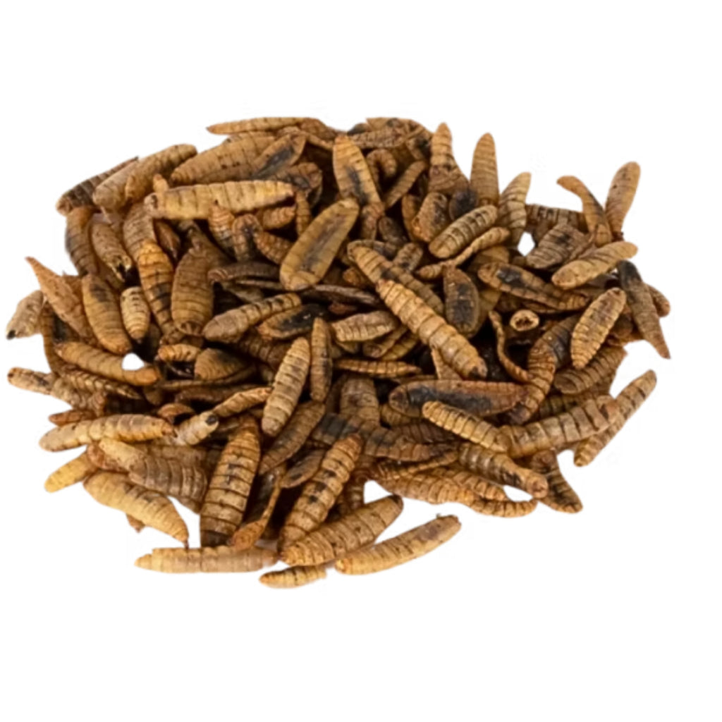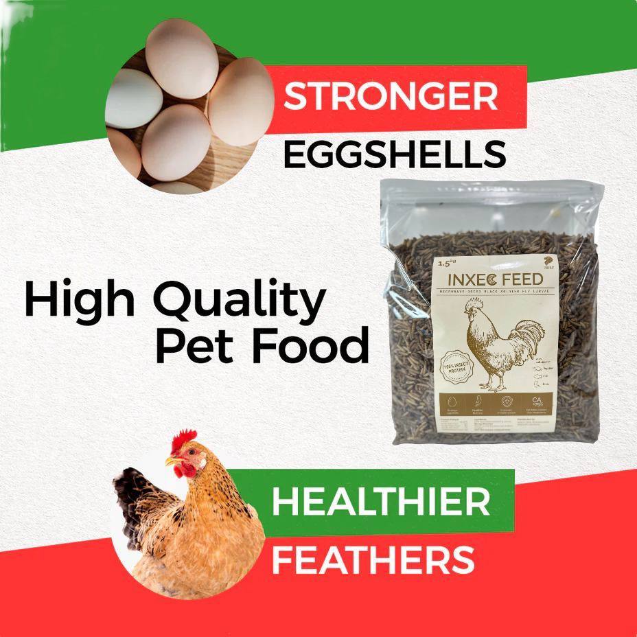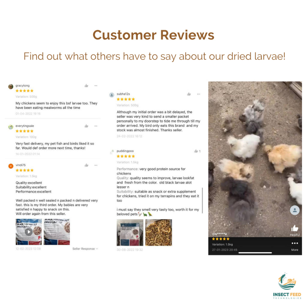 Dried BSF Larvae 1.5KG - a nutrient-rich protein supplement for chickens. These larvae are produced sustainably in Singapore and have been approved by the Singapore Food Agency for strict hygiene and quality standards. They contain high-quality protein, healthy fatty acids and amino acids which promote optimal nutrition and immunity for your beloved pets. Plus, our larvae are 100% natural and hypoallergenic, making them a perfect treat for even the most sensitive chickens. Experience the natural nutty taste and nutritional benefits with our flash-dried larvae - a top alternative to traditional dried mealworms.